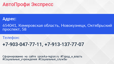 АвтоПрофи & Экспресс по адресу 654041, Кемеровская область, Новокузнецк, Октябрьский проспект, 58 в дальнейшем Организация, размещена в следующих категориях: