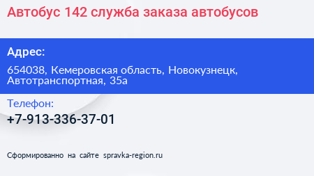 Автобус 142, служба заказа автобусов по адресу 654038, Кемеровская область, Новокузнецк, Автотранспортная, 35а в дальнейшем Организация, размещена в следующих категориях: