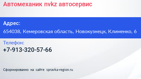 Автомеханик nvkz, автосервис по адресу 654038, Кемеровская область, Новокузнецк, Клименко, 6 в дальнейшем Организация, размещена в следующих категориях: