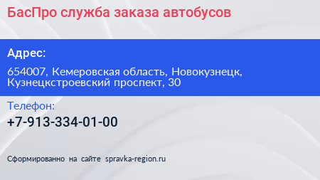 БасПро, служба заказа автобусов по адресу 654007, Кемеровская область, Новокузнецк, Кузнецкстроевский проспект, 30 в дальнейшем Организация, размещена в следующих категориях: