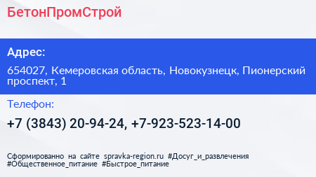 БетонПромСтрой по адресу 654027, Кемеровская область, Новокузнецк, Пионерский проспект, 1 в дальнейшем Организация, размещена в следующих категориях: