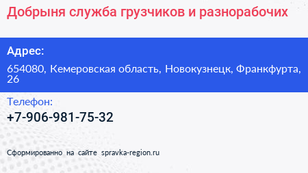 Добрыня, служба грузчиков и разнорабочих по адресу 654080, Кемеровская область, Новокузнецк, Франкфурта, 26 в дальнейшем Организация, размещена в следующих категориях: