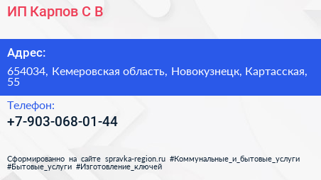 ИП Карпов С.В. по адресу 654034, Кемеровская область, Новокузнецк, Картасская, 55 в дальнейшем Организация, размещена в следующих категориях: