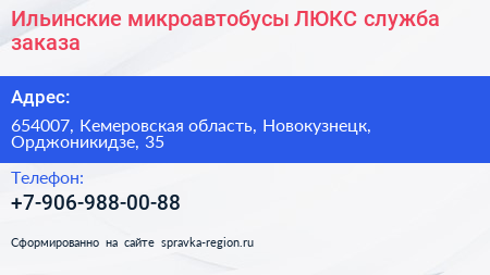 Ильинские микроавтобусы ЛЮКС, служба заказа по адресу 654007, Кемеровская область, Новокузнецк, Орджоникидзе, 35 в дальнейшем Организация, размещена в следующих категориях: