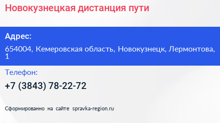 Новокузнецкая дистанция пути по адресу 654004, Кемеровская область, Новокузнецк, Лермонтова, 1 в дальнейшем Организация, размещена в следующих категориях: