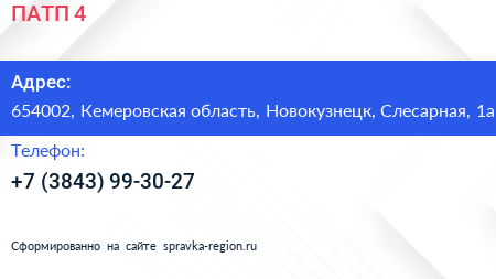 ПАТП-4 по адресу 654002, Кемеровская область, Новокузнецк, Слесарная, 1а в дальнейшем Организация, размещена в следующих категориях: