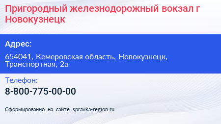 Пригородный железнодорожный вокзал, г. Новокузнецк по адресу 654041, Кемеровская область, Новокузнецк, Транспортная, 2а в дальнейшем Организация, размещена в следующих категориях: