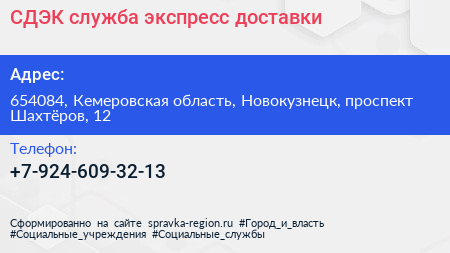 СДЭК, служба экспресс-доставки по адресу 654084, Кемеровская область, Новокузнецк, проспект Шахтёров, 12 в дальнейшем Организация, размещена в следующих категориях: