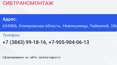 СИБТРАНСМОНТАЖ по адресу 654006, Кемеровская область, Новокузнецк, Чайкиной, 18а в дальнейшем Организация, размещена в следующих категориях: