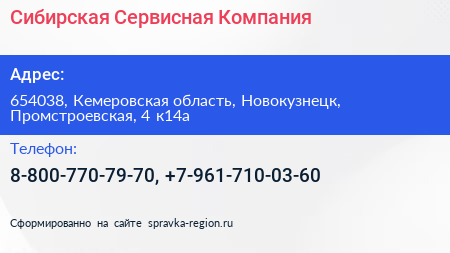 Сибирская Сервисная Компания по адресу 654038, Кемеровская область, Новокузнецк, Промстроевская, 4 к14а в дальнейшем Организация, размещена в следующих категориях: