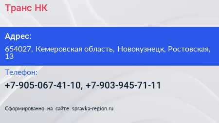 Транс НК по адресу 654027, Кемеровская область, Новокузнецк, Ростовская, 13 в дальнейшем Организация, размещена в следующих категориях: