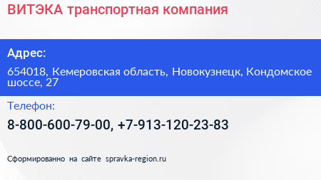 ВИТЭКА, транспортная компания по адресу 654018, Кемеровская область, Новокузнецк, Кондомское шоссе, 27 в дальнейшем Организация, размещена в следующих категориях: