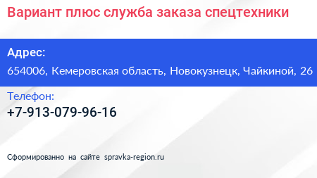 Вариант плюс, служба заказа спецтехники по адресу 654006, Кемеровская область, Новокузнецк, Чайкиной, 26 в дальнейшем Организация, размещена в следующих категориях: