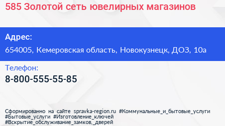 585 Золотой, сеть ювелирных магазинов по адресу 654005, Кемеровская область, Новокузнецк, ДОЗ, 10а в дальнейшем Организация, размещена в следующих категориях: