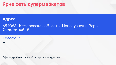 Ярче!, сеть супермаркетов по адресу 654063, Кемеровская область, Новокузнецк, Веры Соломиной, 9 в дальнейшем Организация, размещена в следующих категориях: