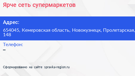 Ярче!, сеть супермаркетов по адресу 654045, Кемеровская область, Новокузнецк, Пролетарская, 148 в дальнейшем Организация, размещена в следующих категориях: