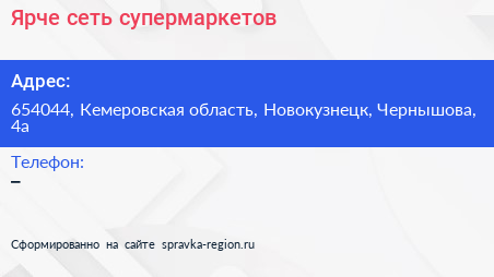 Ярче!, сеть супермаркетов по адресу 654044, Кемеровская область, Новокузнецк, Чернышова, 4а в дальнейшем Организация, размещена в следующих категориях: