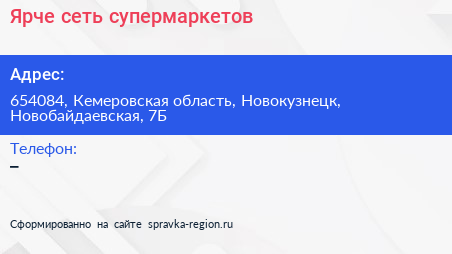 Ярче!, сеть супермаркетов по адресу 654084, Кемеровская область, Новокузнецк, Новобайдаевская, 7Б в дальнейшем Организация, размещена в следующих категориях: