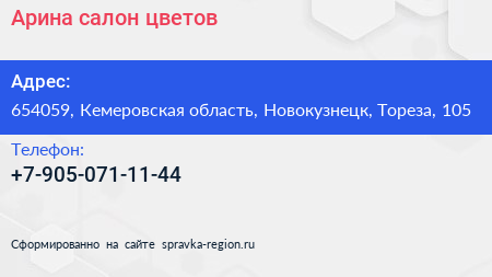 Арина, салон цветов по адресу 654059, Кемеровская область, Новокузнецк, Тореза, 105 в дальнейшем Организация, размещена в следующих категориях:
