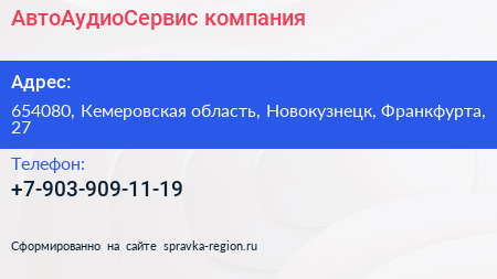 АвтоАудиоСервис, компания по адресу 654080, Кемеровская область, Новокузнецк, Франкфурта, 27 в дальнейшем Организация, размещена в следующих категориях: