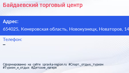 Байдаевский, торговый центр по адресу 654025, Кемеровская область, Новокузнецк, Новаторов, 14 в дальнейшем Организация, размещена в следующих категориях: