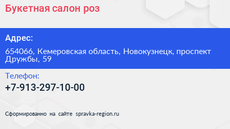 Букетная, салон роз по адресу 654066, Кемеровская область, Новокузнецк, проспект Дружбы, 59 в дальнейшем Организация, размещена в следующих категориях: