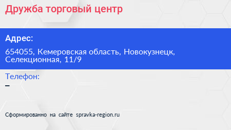 Дружба, торговый центр по адресу 654055, Кемеровская область, Новокузнецк, Селекционная, 11/9 в дальнейшем Организация, размещена в следующих категориях: