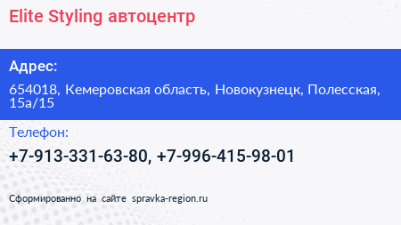 Elite Styling, автоцентр по адресу 654018, Кемеровская область, Новокузнецк, Полесская, 15а/15 в дальнейшем Организация, размещена в следующих категориях: