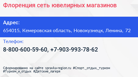 Флоренция, сеть ювелирных магазинов по адресу 654015, Кемеровская область, Новокузнецк, Ленина, 72 в дальнейшем Организация, размещена в следующих категориях:
