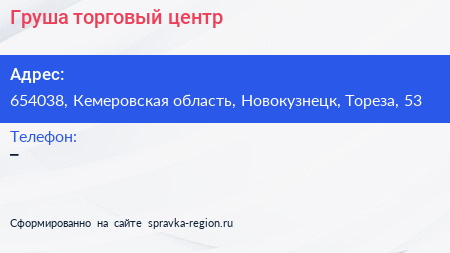 Груша, торговый центр по адресу 654038, Кемеровская область, Новокузнецк, Тореза, 53 в дальнейшем Организация, размещена в следующих категориях: