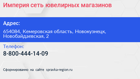 Империя, сеть ювелирных магазинов по адресу 654084, Кемеровская область, Новокузнецк, Новобайдаевская, 2 в дальнейшем Организация, размещена в следующих категориях: