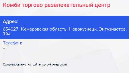 Комби, торгово-развлекательный центр по адресу 654027, Кемеровская область, Новокузнецк, Энтузиастов, 16а в дальнейшем Организация, размещена в следующих категориях: