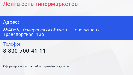 Лента, сеть гипермаркетов по адресу 654066, Кемеровская область, Новокузнецк, Транспортная, 136 в дальнейшем Организация, размещена в следующих категориях: