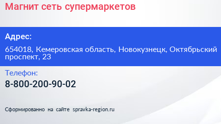 Магнит, сеть супермаркетов по адресу 654018, Кемеровская область, Новокузнецк, Октябрьский проспект, 23 в дальнейшем Организация, размещена в следующих категориях: