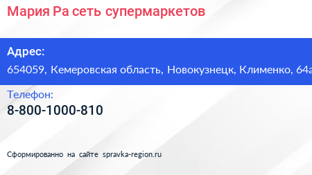 Мария-Ра, сеть супермаркетов по адресу 654059, Кемеровская область, Новокузнецк, Клименко, 64а в дальнейшем Организация, размещена в следующих категориях: