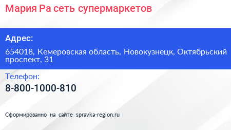 Мария-Ра, сеть супермаркетов по адресу 654018, Кемеровская область, Новокузнецк, Октябрьский проспект, 31 в дальнейшем Организация, размещена в следующих категориях: