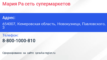 Мария-Ра, сеть супермаркетов по адресу 654007, Кемеровская область, Новокузнецк, Павловского, 3 в дальнейшем Организация, размещена в следующих категориях: