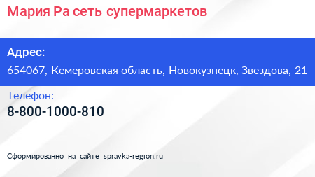 Мария-Ра, сеть супермаркетов по адресу 654067, Кемеровская область, Новокузнецк, Звездова, 21 в дальнейшем Организация, размещена в следующих категориях: