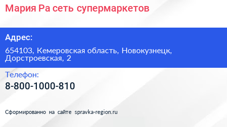 Мария-Ра, сеть супермаркетов по адресу 654103, Кемеровская область, Новокузнецк, Дорстроевская, 2 в дальнейшем Организация, размещена в следующих категориях: