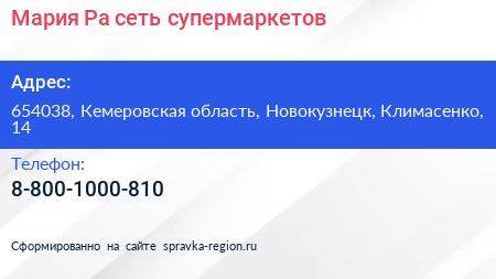 Мария-Ра, сеть супермаркетов по адресу 654038, Кемеровская область, Новокузнецк, Климасенко, 14 в дальнейшем Организация, размещена в следующих категориях: