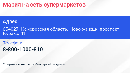 Мария-Ра, сеть супермаркетов по адресу 654027, Кемеровская область, Новокузнецк, проспект Курако, 41 в дальнейшем Организация, размещена в следующих категориях: