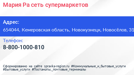 Мария-Ра, сеть супермаркетов по адресу 654044, Кемеровская область, Новокузнецк, Новосёлов, 31 в дальнейшем Организация, размещена в следующих категориях: