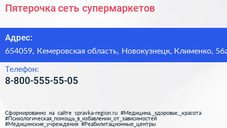 Пятерочка, сеть супермаркетов по адресу 654059, Кемеровская область, Новокузнецк, Клименко, 56а в дальнейшем Организация, размещена в следующих категориях: