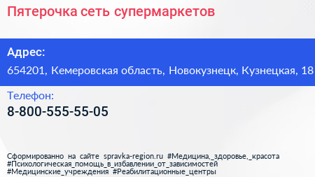 Пятерочка, сеть супермаркетов по адресу 654201, Кемеровская область, Новокузнецк, Кузнецкая, 18 в дальнейшем Организация, размещена в следующих категориях: