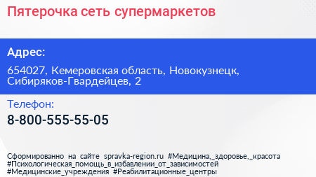 Пятерочка, сеть супермаркетов по адресу 654027, Кемеровская область, Новокузнецк, Сибиряков-Гвардейцев, 2 в дальнейшем Организация, размещена в следующих категориях: