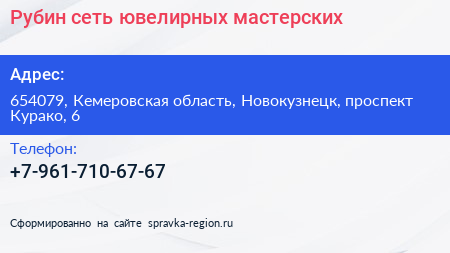 Рубин, сеть ювелирных мастерских по адресу 654079, Кемеровская область, Новокузнецк, проспект Курако, 6 в дальнейшем Организация, размещена в следующих категориях: