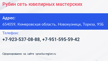 Рубин, сеть ювелирных мастерских по адресу 654059, Кемеровская область, Новокузнецк, Тореза, 95Б в дальнейшем Организация, размещена в следующих категориях: