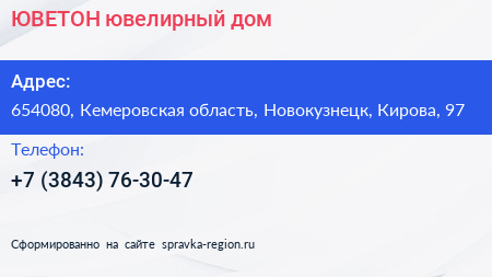 ЮВЕТОН, ювелирный дом по адресу 654080, Кемеровская область, Новокузнецк, Кирова, 97 в дальнейшем Организация, размещена в следующих категориях: