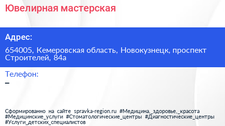 Ювелирная мастерская по адресу 654005, Кемеровская область, Новокузнецк, проспект Строителей, 84а в дальнейшем Организация, размещена в следующих категориях:
