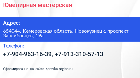 Ювелирная мастерская по адресу 654044, Кемеровская область, Новокузнецк, проспект Запсибовцев, 19а в дальнейшем Организация, размещена в следующих категориях: